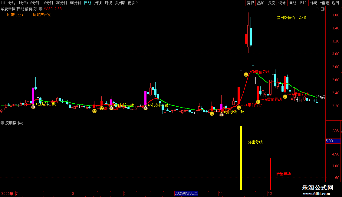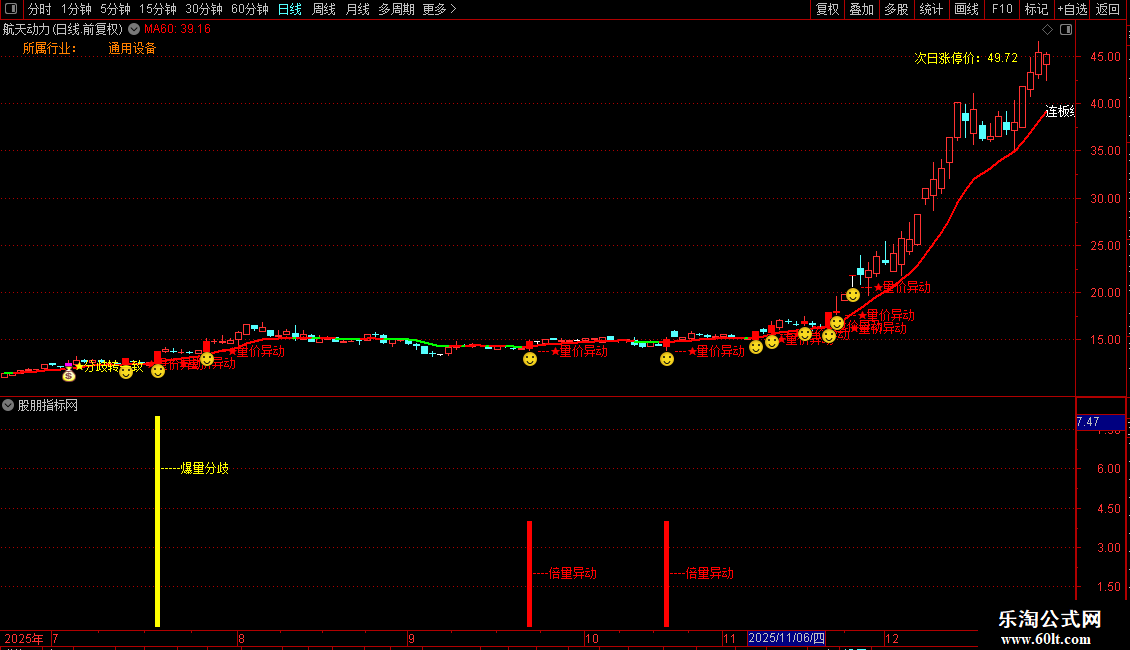 指标主要用于识别潜在强势股的启动信号,结合不同股票的涨跌停规则动态计算次日涨停价,并通过价格、成交量与均线系统判断市场情绪和资金动向。当股价放量上涨、收阳线且突破关键均线压力时,视为“分歧转一致”的买入机会;若仅出现明显放量阳线但未满足更强条件,则标记为“量价异动”,提示关注。策略上,投资者可优先关注带★信号的个股,结合行业信息辅助决策。