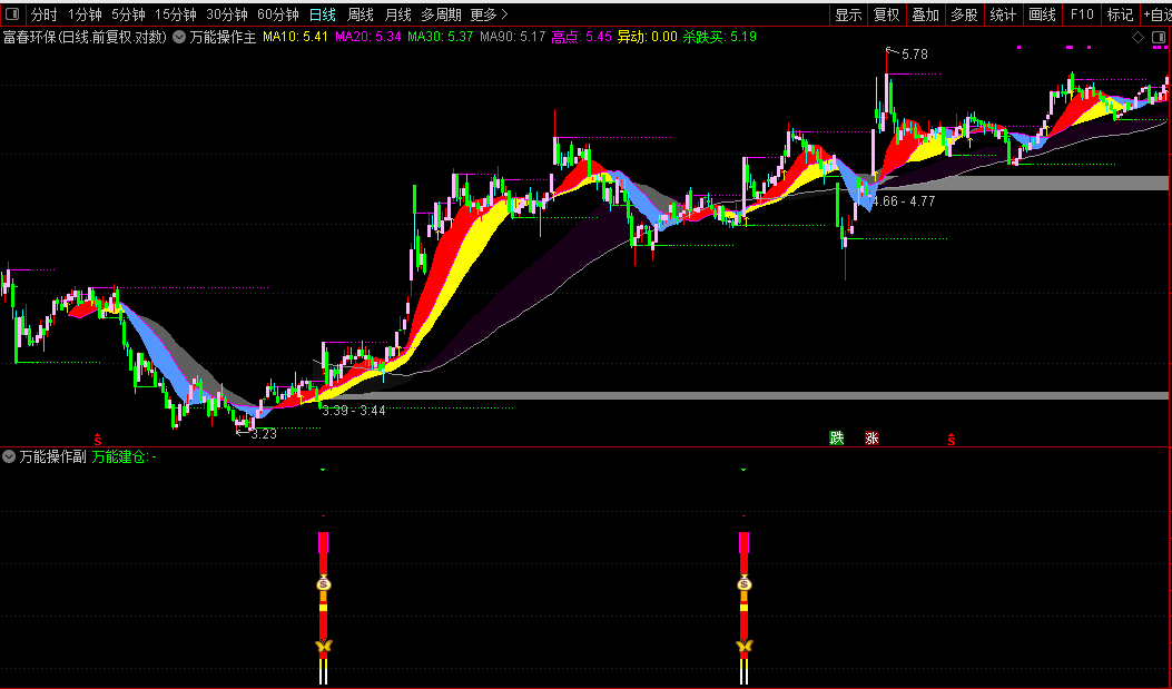主图主要展示清晰的波段操作参考。图中通过不同颜色的均线带直观显示短、中、长期趋势。核心功能是自动标记“高点”压力和“杀跌买”支撑。当股价突破近期“高点”时,附图标记提示可能打开上行空间。当股价回调至近期“杀跌买”支撑位时,该位置会显示为绿色点状线,提示短线超跌后的潜在买入机会,辅助用户进行高抛低吸。