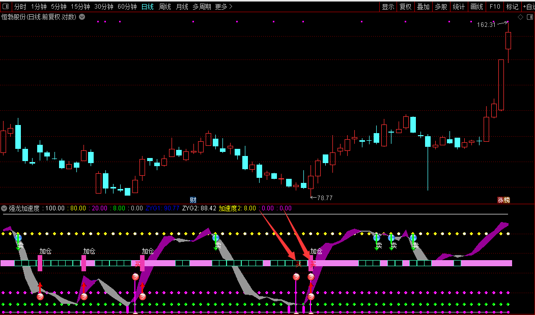 指标图中包含多条关键水平线,其中8、20、80为重要分界线。当指标线自下而上突破8时,指标会发出“买”的信号,提示潜在的入场机会;若继续向上突破20,则提示“加仓”,意味着短期上涨动能进一步增强。相反,当指标线从高位向下跌破80时,会提示“卖”,表明上涨动能可能衰竭,需注意风险。指标通过颜色变化与信号图标直观显示指标线与均线的相对强弱关系,便于快速识别趋势的加速与减速阶段。