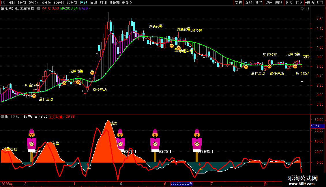 主要含义是通过多周期信号共振,精准捕捉超短线强势股的见底反转与启动时机,并识别上升途中的洗盘行为。包含见底预警和最佳启动两个核心提示。当趋势跌至阶段性底部区域时,出现见底预警信号;确认反转后,在趋势加速起点给出最佳启动上车提示。出现财神图标时,代表资金异动,往往是机构或大资金开始介入的信号,助力超短线精准。