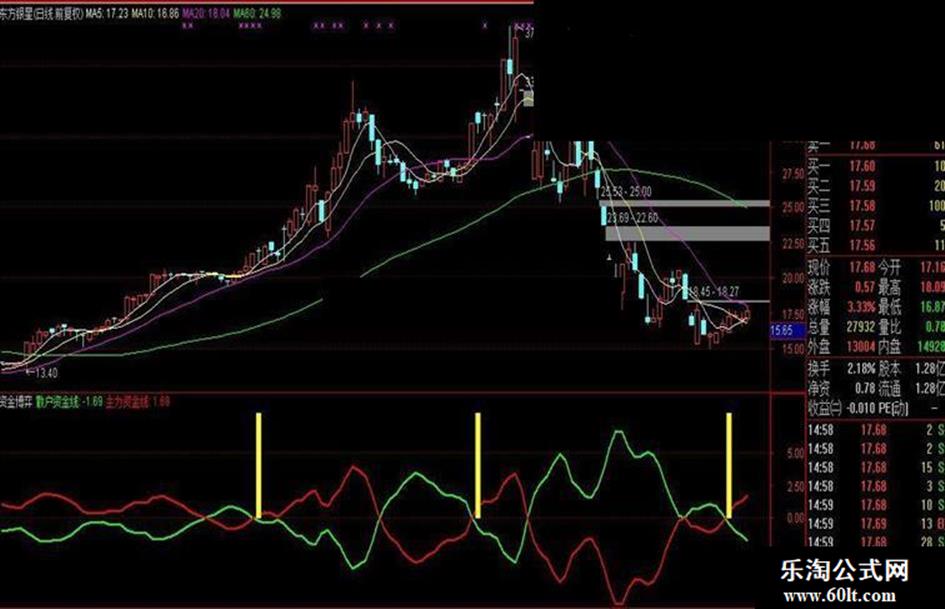 3.黄色柱子为主力资金上穿散户资金线的位置,附带黄柱选股。