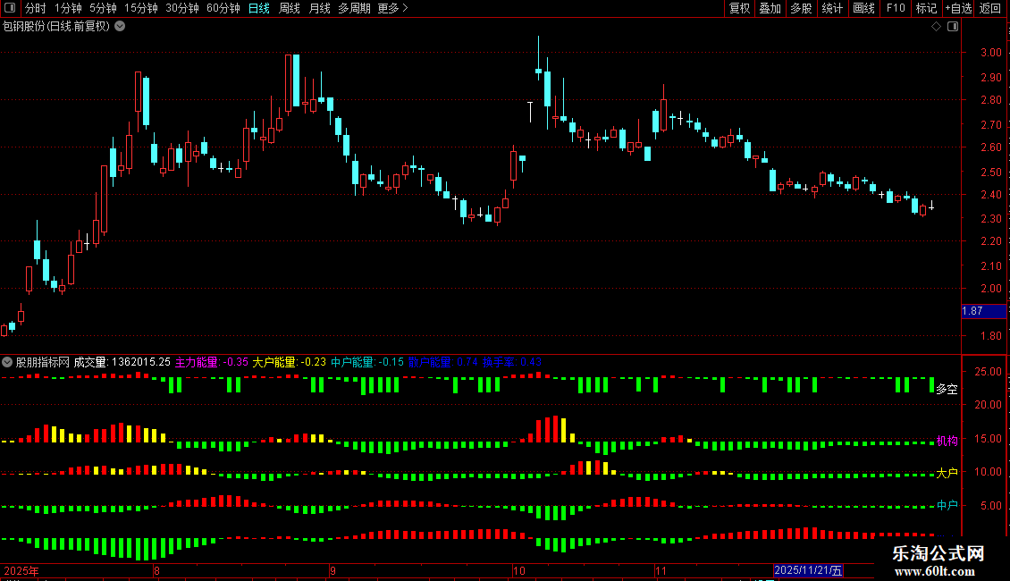 输出反弹1:当满足条件大户能量<0AND大户能量>=1日前的大户能量时,在9.6和9.6+大户能量位置之间画柱状线,宽度为1.5,0不为0则画空心柱.,画绿色