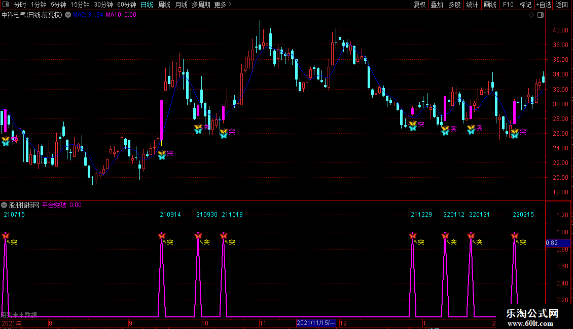 指标旨在识别价格对近期高点平台的突破行为。通过定位过去一段时间内的显著高点,绘制水平阻力线,当股价向上穿越该平台时,视为趋势转强信号,并以醒目标记提示突破位置。同时结合短期均线辅助判断走势方向,若伴随强势阳线或涨停,则增强信号有效性。操作上,投资者可在有效突破平台后考虑跟进,捕捉趋势启动初期的机会。