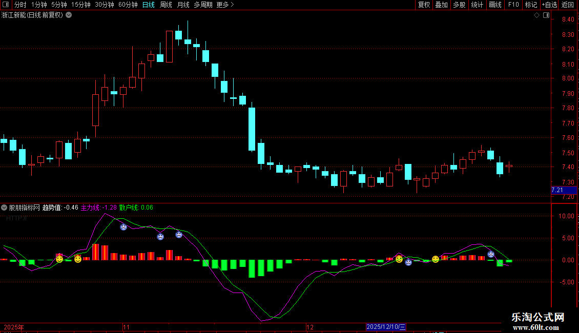 2、当指标出现笑脸图标时,为短期强势启动买入信号;紫色线上穿红柱或绿色线,表明行情走强;若紫色线下穿绿色线,则提示注意止盈离场。