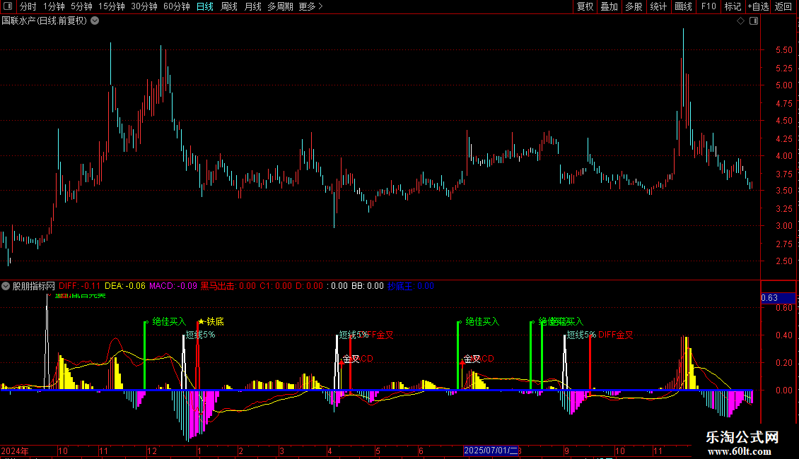 (0.4 * ((CROSS(操盘手,MACD) AND (MACD <= (0 - 0.11))) AND (LOW <= 下))),LINETHICK2,COLORFFFFFF;