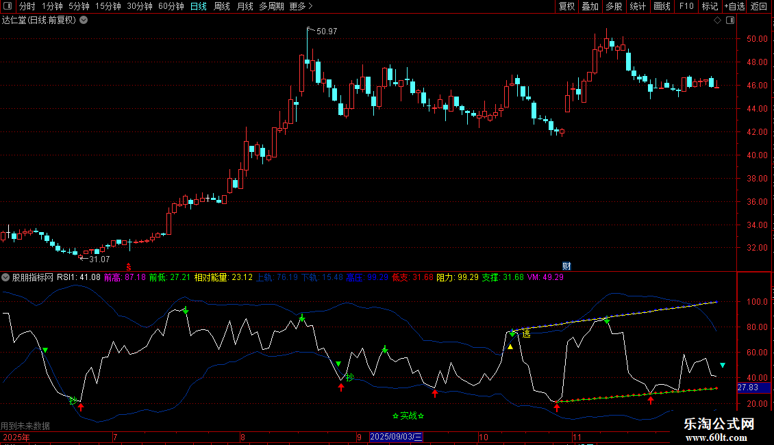 阻力:DRAWLINE(D1,RSI1,S11,RSI1,1),COLORYELLOW;