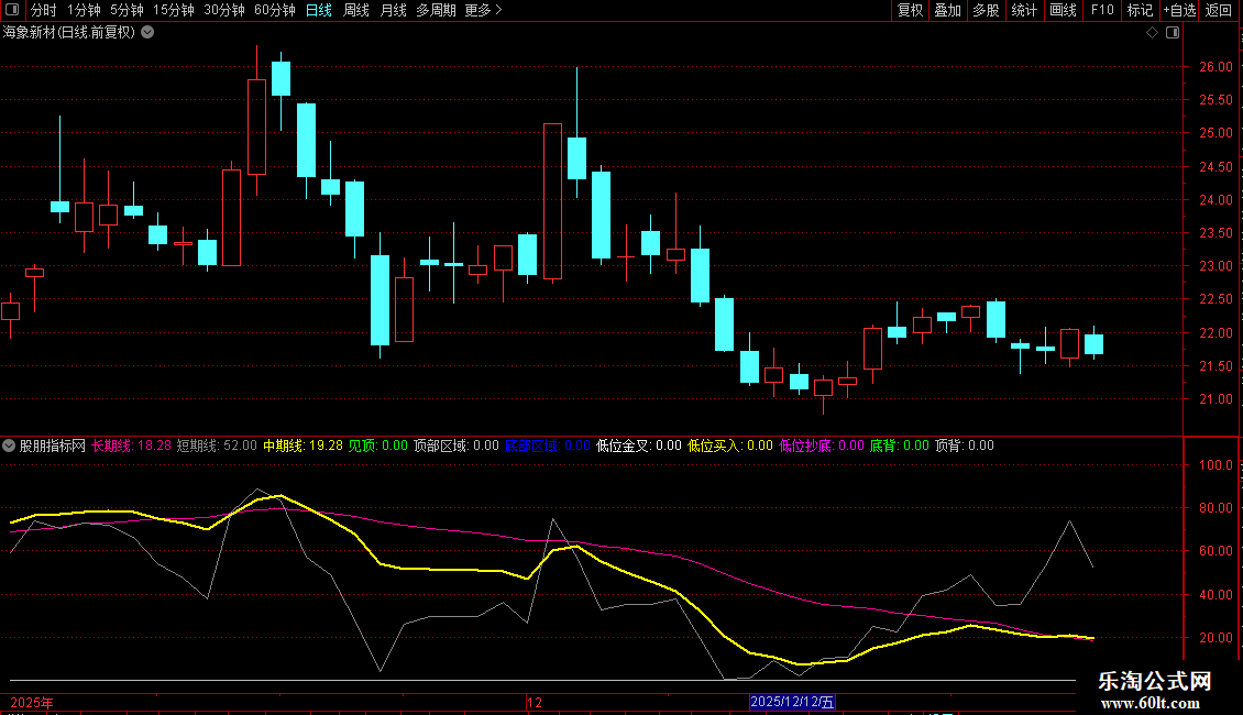 底部区域:(长期线<12 AND 中期线<8 AND (短期线<7.2 OR REF(短期线,1)<5) AND (中期线>REF(中期线,1) OR 短期线>REF(短期线,1)))