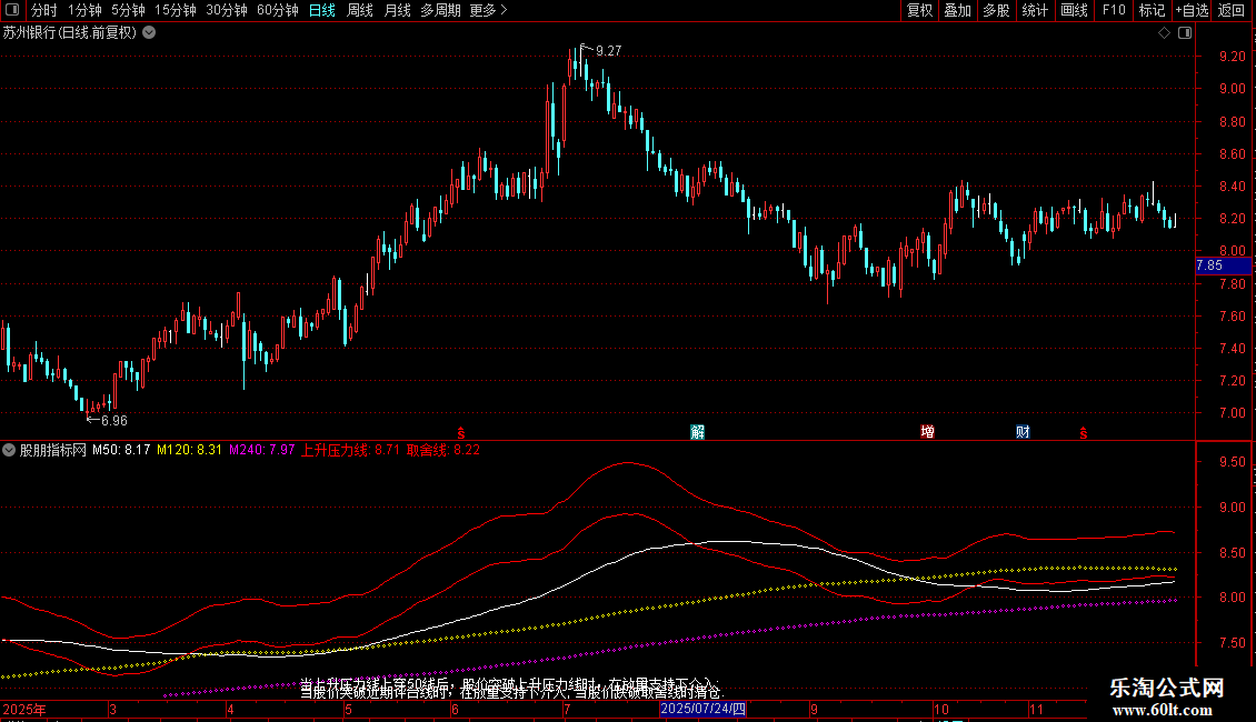 DRAWTEXT_FIX(1,0.25,0.9,0,'当上升压力线上穿50线后,股价突破上升压力线时,在放量支持下介入;');
