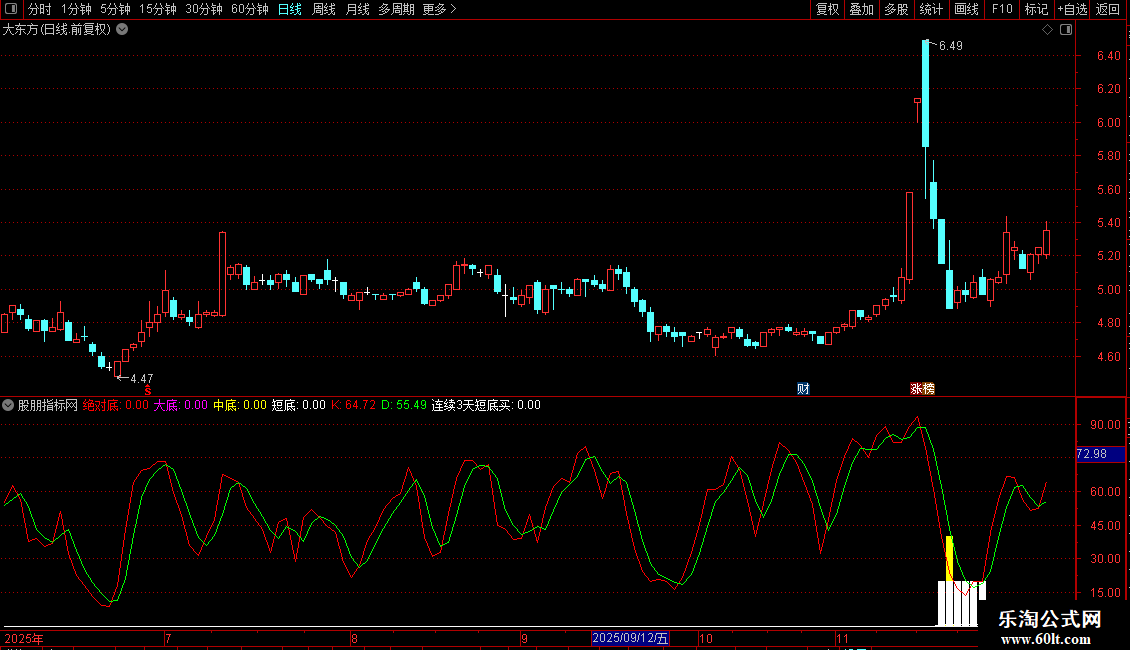 D: EMA(0.667*REF(K,1)+0.333*K,2),COLORGREEN,LINETHICK1;
