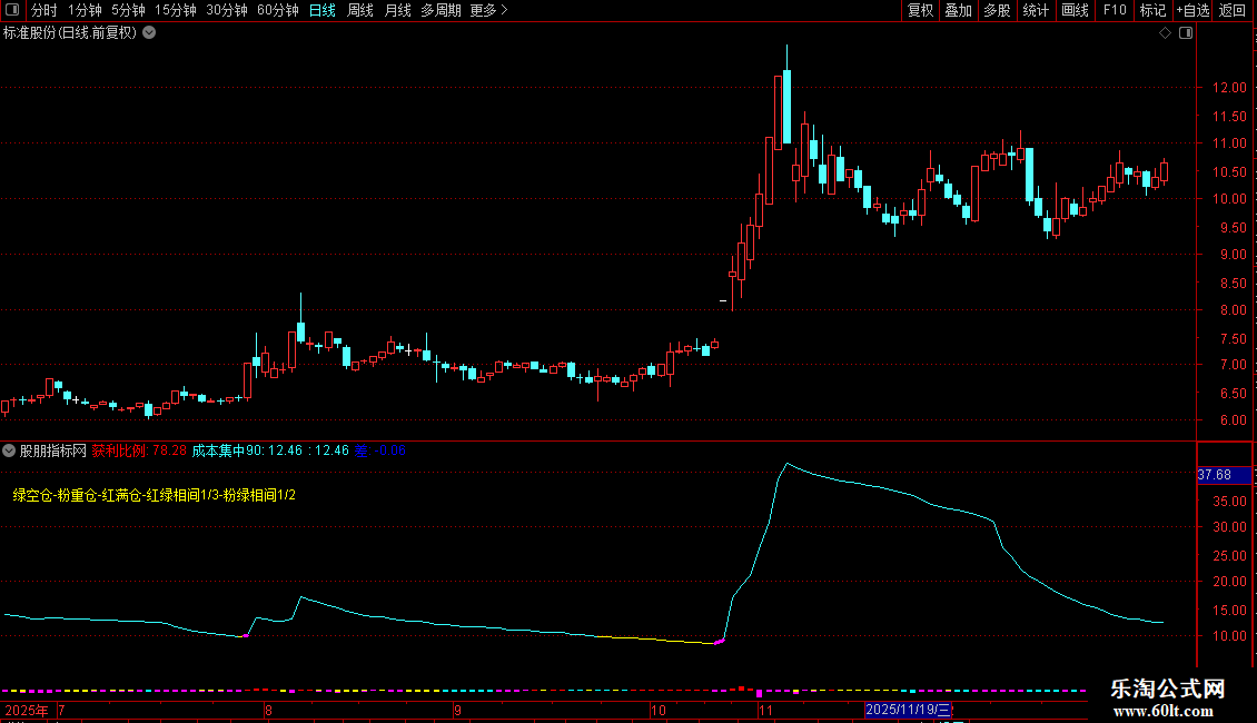 IF(成本集中90<=10 AND WINNER(CLOSE)*100>90,成本集中90,DRAWNULL),COLORMAGENTA,LINETHICK3;