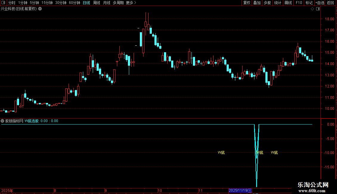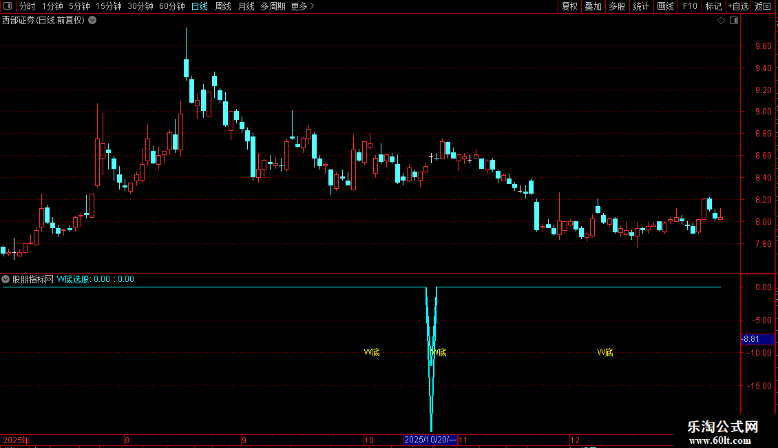 指标基于MACD构建,主要识别特定形态的“W底”反转信号。其核心逻辑是:当DIFF在零轴下方上穿DEA形成金叉,并结合DEA由正转负的背景,系统会累计符合条件的金叉次数;一旦累计次数比历史最高值多出两次,且当前次数较前一日增加,即触发选股信号。此时在图上标记“W底”字样并输出固定数值提示。操作上,投资者可将此作为潜在底部反弹的参考依据,配合其他确认信号择机介入。