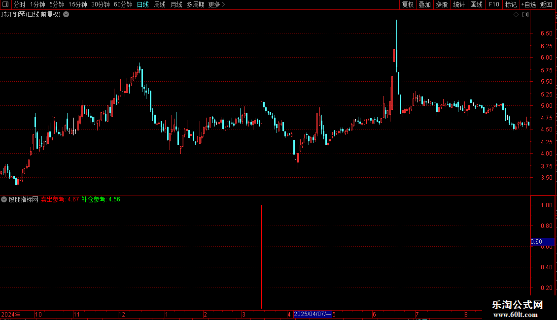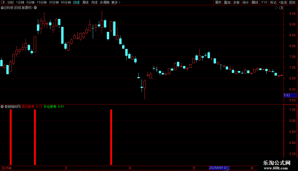 指标主要帮助识别股票短期顶部和底部,提供卖出和补仓参考。通过计算最高价和最低价的移动平均值来设定卖出和补仓的价格参考线,并结合价格突破、相对强弱指标变化等条件判断买入时机。特别地,当市场出现连续弱势后首次强势反转时,会发出明确的买入信号,以蓝色柱状图显示,辅助投资者捕捉短线反弹机会。