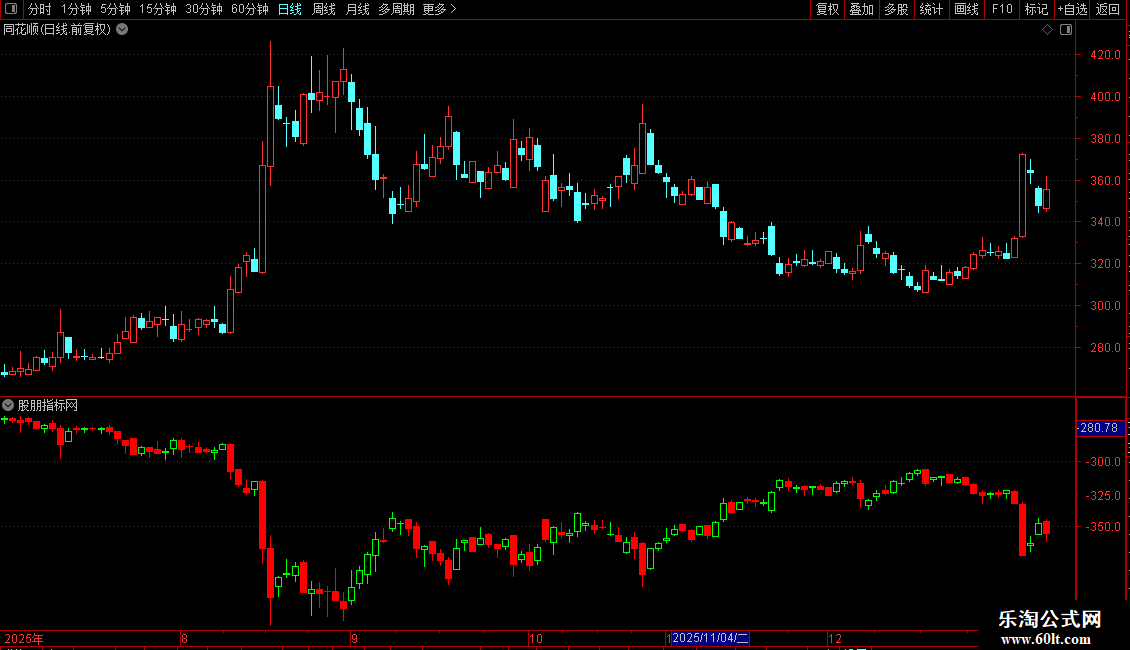 STICKLINE(OPEN<C,0-OPEN,0-C,3,0),COLORRED;STICKLINE(OPEN<C,0-C,0-H,0,0),COLORRED;STICKLINE(OPEN<C,0-L,0-OPEN,0,0),COLORRED;STICKLINE(OPEN>C,0-OPEN,0-C,3,1),COLORGREEN;STICKLINE(OPEN>C,0-H,0-OPEN,0,0),COLORGREEN;STICKLINE(OPEN>C,0-L,0-C,0,0),COLORGREEN;STICKLINE(C>REF(C,1) AND OPEN=C,0-OPEN,0-C,2,1),COLORRED;STICKLINE(C>REF(C,1) AND O=C,0-L,0-H,0,0),COLORRED;STICKLINE(C=REF(C,1) AND O=C,0-O,0-C,2,1),COLORGREEN;STICKLINE(C=REF(C,1) AND O=C,0-L,0-H,0,0),COLORGREEN;STICKLINE(C<REF(C,1) AND O=C,0-O,0-C,2,1),COLORGREEN;STICKLINE(C<REF(C,1) AND O=C,0-L,0-H,0,0),COLORGREEN;{MA5:MA(-C,5),COLORWHITE;MA10:MA(-C,10),COLORYELLOW;MA20:MA(-C,20),COLORMAGENTA,LINETHICK2;MA30:MA(-C,30),COLORGREEN;MA60:MA(-C,60),COLORCYAN;MA120:MA(-C,120),COLORRED;MA240:MA(-C,240),COLORGREEN;};