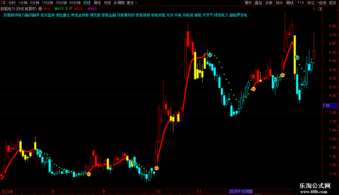 指标通过构建一条动态变化的参考线,结合价格与趋势的交叉关系,辅助判断波段操作的买卖时机。当股价上穿关键支撑线且处于多头状态时,K线以蓝色高亮显示,提示可能进入上涨波段;反之,若股价跌破该线,则以黄色标识,警示调整风险。同时,指标在主图上直接标注“买入准备”和“卖出准备”的图标信号,便于投资者在趋势拐点附近及时行动。整体适合中短线波段交易,强调顺势而为、跟随趋势。