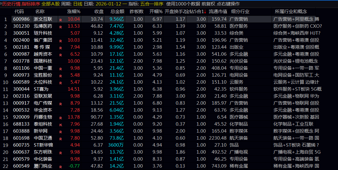 通达信【5合1竞价共振】组合共振强中选强,9:25后,排序,优选 “金钻5合1”中 数值大的票,也可以通过选股选出大于等于共振数3的票。 指标只是个技术参数,左右不了市场情绪,据此操作,风险自担。投资有风险 ,入市需谨慎。为方便大家查看,把昨板数,开盘换手Z,流通市值,行业 概念都加上了。