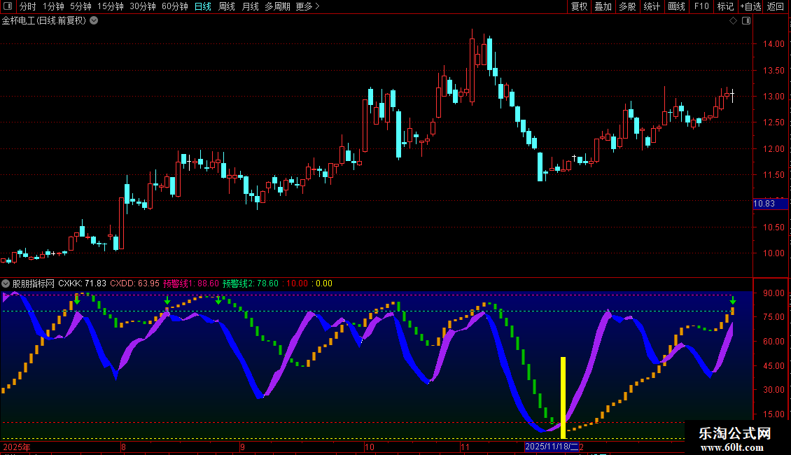 本策略依托CX1(红色)与CX2(黄色)指标线跟踪股价运行趋势,结合KD漂带指标(CXKK与CXDD线)清晰标识强弱区间,并设置0、10、78.6、88.6四条关键预警线。该系统提供明确的与交易信号:当CXKK线上穿10且其差值不超过1时,发出买入信号;持仓线超过88.6时,提示卖出预警。CXD1动能柱以红色上涨、绿色下跌直观反映动力强弱,适用于震荡行情中捕捉短线机会,也可用于筛选具备强势突破潜力的个股。
