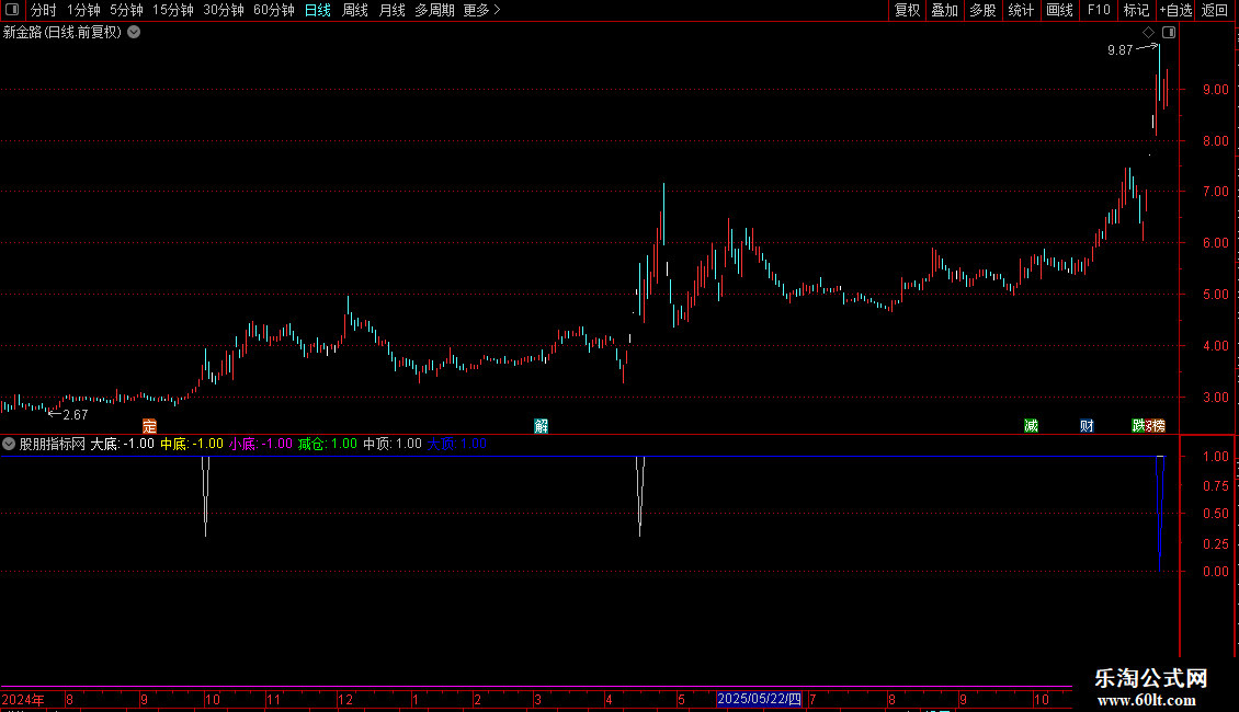 X:=MA(AMOUNT,5)/MA(V,5)/100; VAR3:=(X-MA(AMOUNT,125)/MA(V,125)/100)/X; VAR4:=MA((LLV(L,45)-C)/(HHV(H,45)-LLV(L,45))*100,3); VAR5:=C/MA(C,60)-1; 大底:IF(CROSS(-5,VAR4) AND VAR3<-0.4,-0.01,-1); 中底:IF(CROSS(-5,VAR4) AND VAR3<-0.25 AND VAR3>-0.4,-0.3,-1); 小底:IF(CROSS(-5,VAR4) AND VAR3<-0.15 AND VAR3>-0.25,-0.6,-1); 减仓:IF(CROSS(VAR4,-95) AND VAR5<0.2 AND VAR5>=0.1,0.6,1); 中顶:IF(CROSS(VAR4,-95) AND VAR5<0.35 AND VAR5>=0.2,0.3,1); 大顶:IF(CROSS(VAR4,-95) AND VAR5>=0.35,0,1);