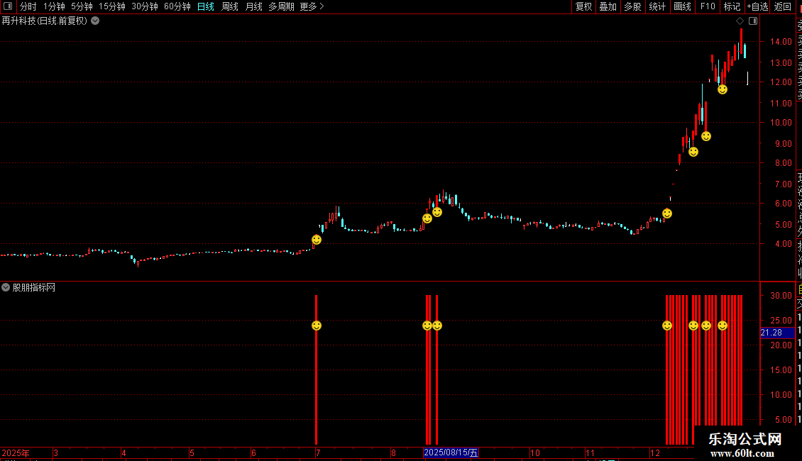 副图指标“风口起爆”:在副图区域同步显示降龙指标和信号。通过图标和色带标注超买与启动点,辅助确认主图信号,增强判断准确性。