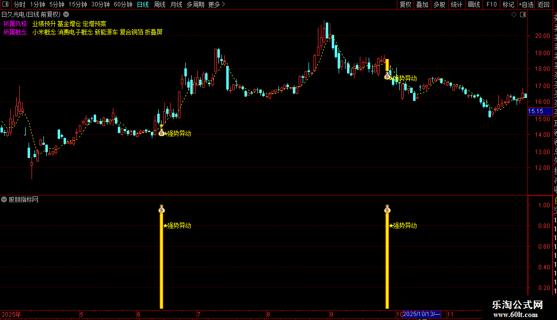 指标主要用于识别A股市场中具有“强势异动”特征的个股。它结合了量价关系、资金活跃度与短期均线趋势,通过分析成交量在不同K线形态下的分布,判断主力资金是否异常介入;同时叠加价格变动幅度、换手率及特定均线排列条件,筛选出处于下跌或震荡末期、但出现放量且技术面转强的股票。当多个条件共振时,系统会发出明确的买入提示信号,并以醒目标记和图标高亮显示。