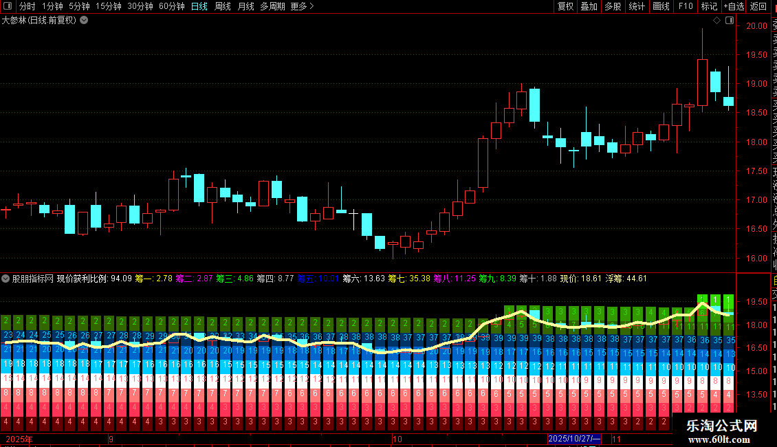 筹码分布是一种能观察筹码动态变化的副图指标。重点提示——安装前务必使用前复权处理数据以避免错误。主界面由三色区域构成:红色区域代表低位筹码聚集区,蓝色区域属于震荡换手区,绿色区域对应高位套牢盘。关键要关注中间的数字序列,其波动直接反映各价位筹码占比的变化。