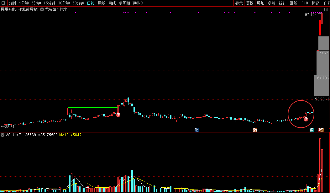 主图红色圆球是选股信号,绿色水平线是前期压力位,是前期的高量位置,高量后挖坑,重新突破,是这个思路的逻辑,主图中红色实体k线是涨停板标注,这个思路基本上可以把握大部分的妖股启动点。
