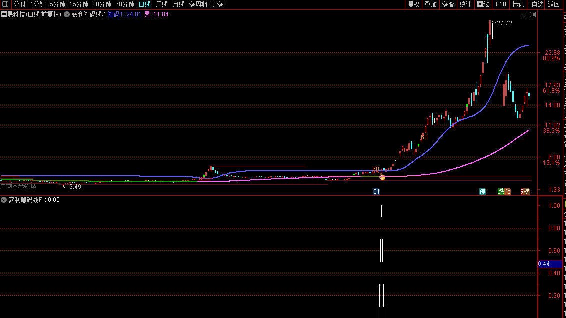 本指标是获利筹码线,是筹码类型公式,用到winner和cost筹码函数。