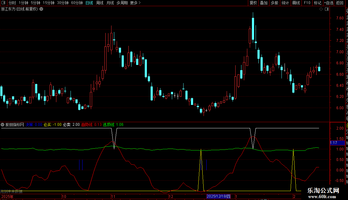必买:使用TROUGHBARS函数寻找最近一个满足条件的波谷位置。若当前是波谷(结果为0)且最高价大于最低价加0.01,则输出1,否则输出-1。以黄色细线显示。