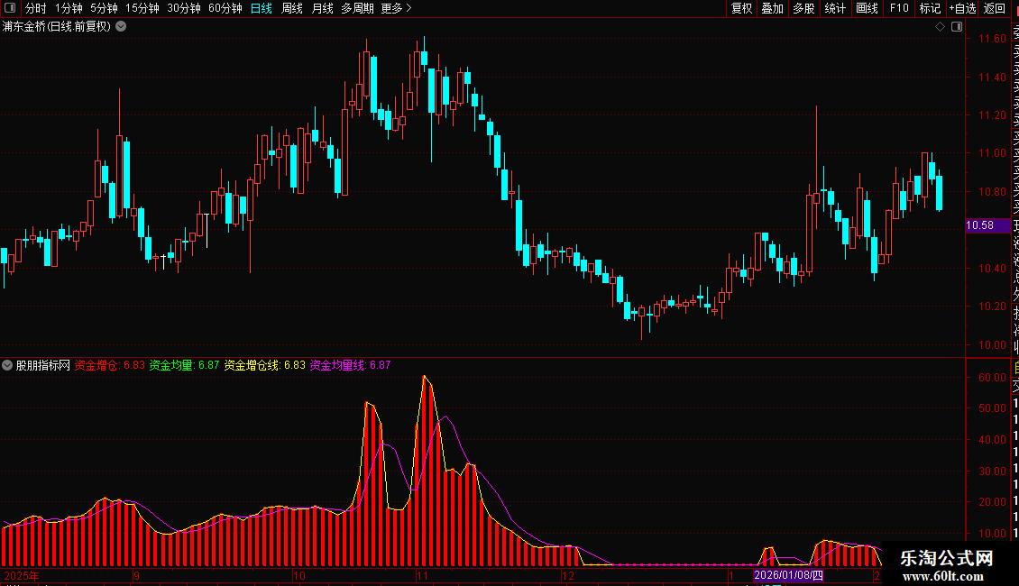 核心观察:关注红色粗柱线(资金增仓) 的出现及其高度,它表示经过公式模型判断后,符合条件的资金流入强度。