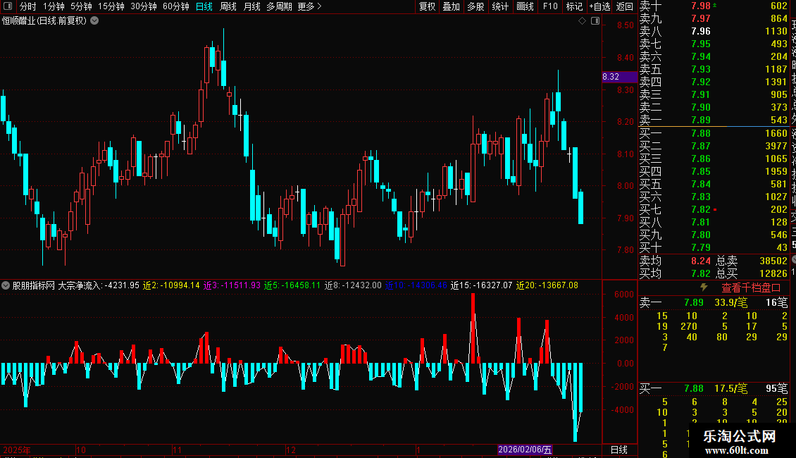 指标计算了“大宗净流入”在最近2、3、5、8、10、15、20个交易日的累计值(分别命名为近2、近3等)。这些累计值不直接绘制在图上,但可供其他公式调用或作为数据显示。