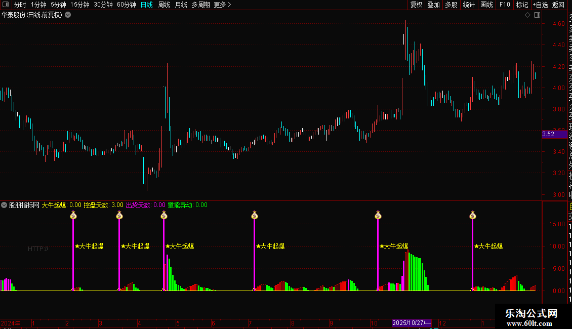 2. 起爆信号提示:当控盘指标上穿0轴(主力开始介入)且MACD处于做多区间时,会触发“★大牛起爆”黄色文字信号,同时伴随品红色柱体及对应图标,为进场提供明确指引;