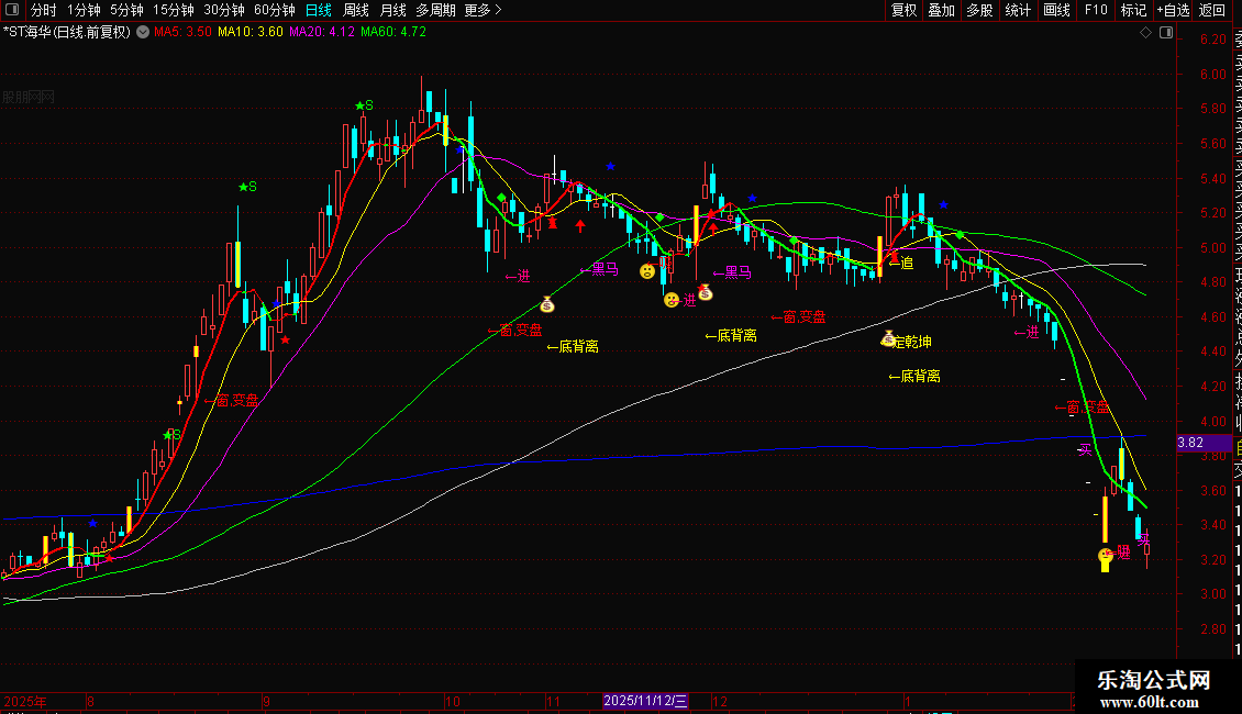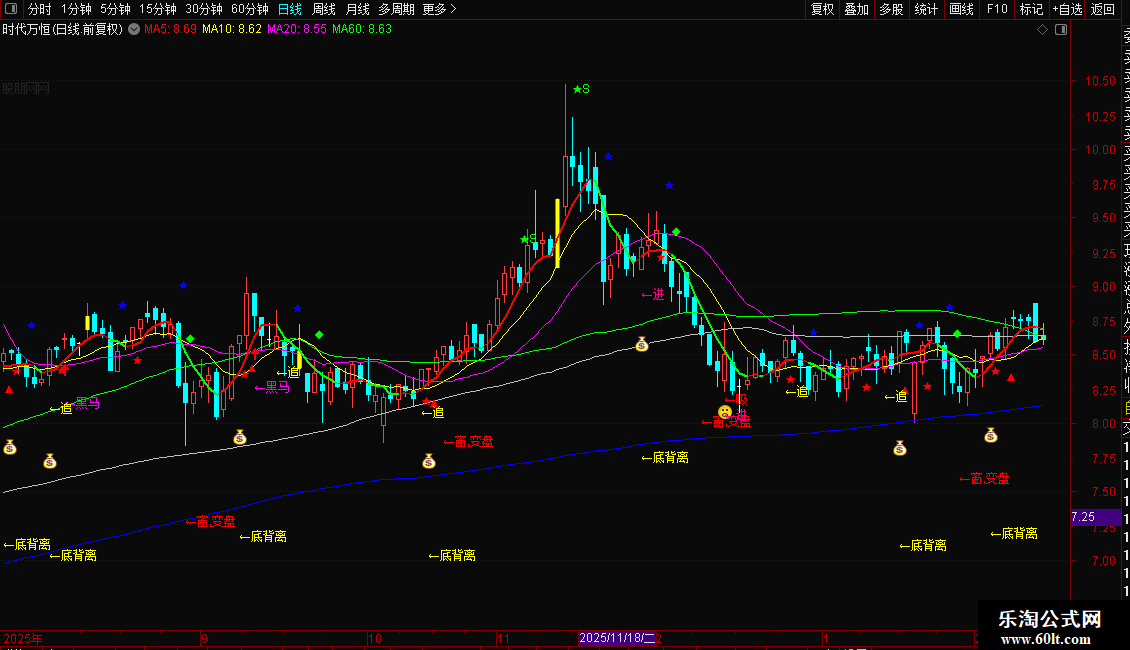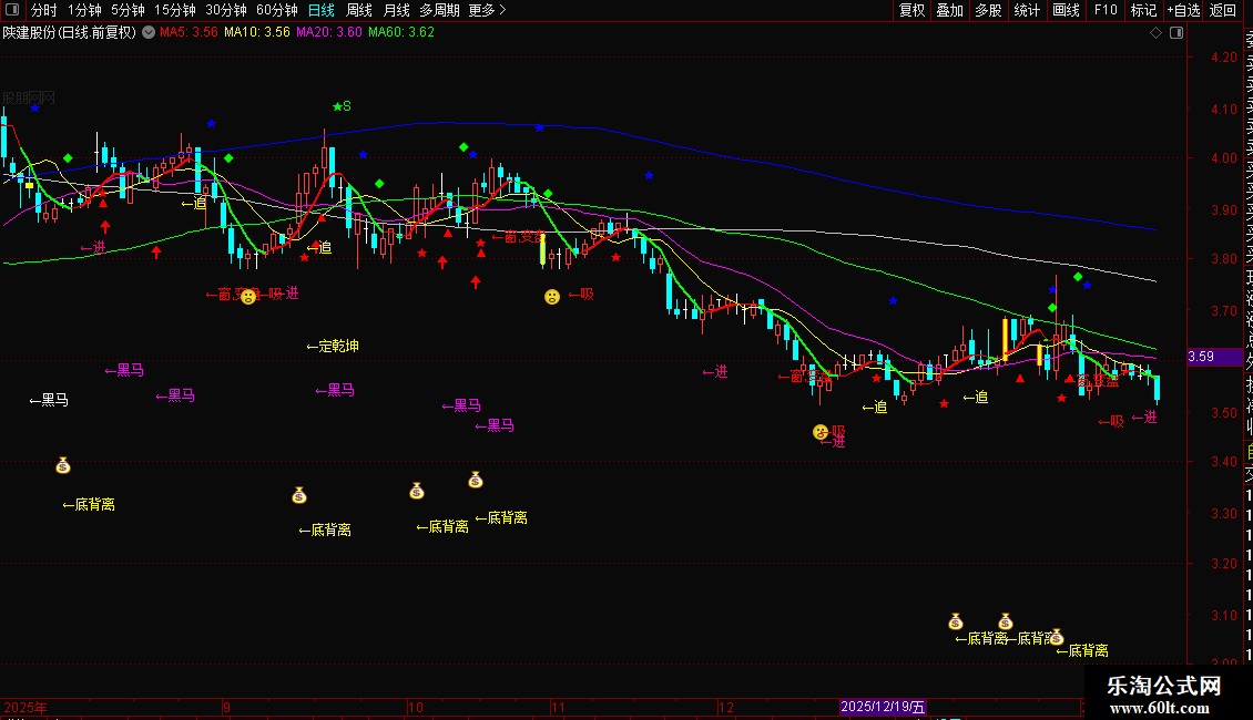 1. **买入信号**:当K线附近出现红色「吸」「买」、粉色「进」、黄色「追」「底背离」「定乾坤」或白色/紫色「黑马」提示时,结合5日均线向上(红色)的趋势,为低买时机;RSI跌破11后金叉、KDJ低位金叉叠加量能放大时,买入信号更可靠。