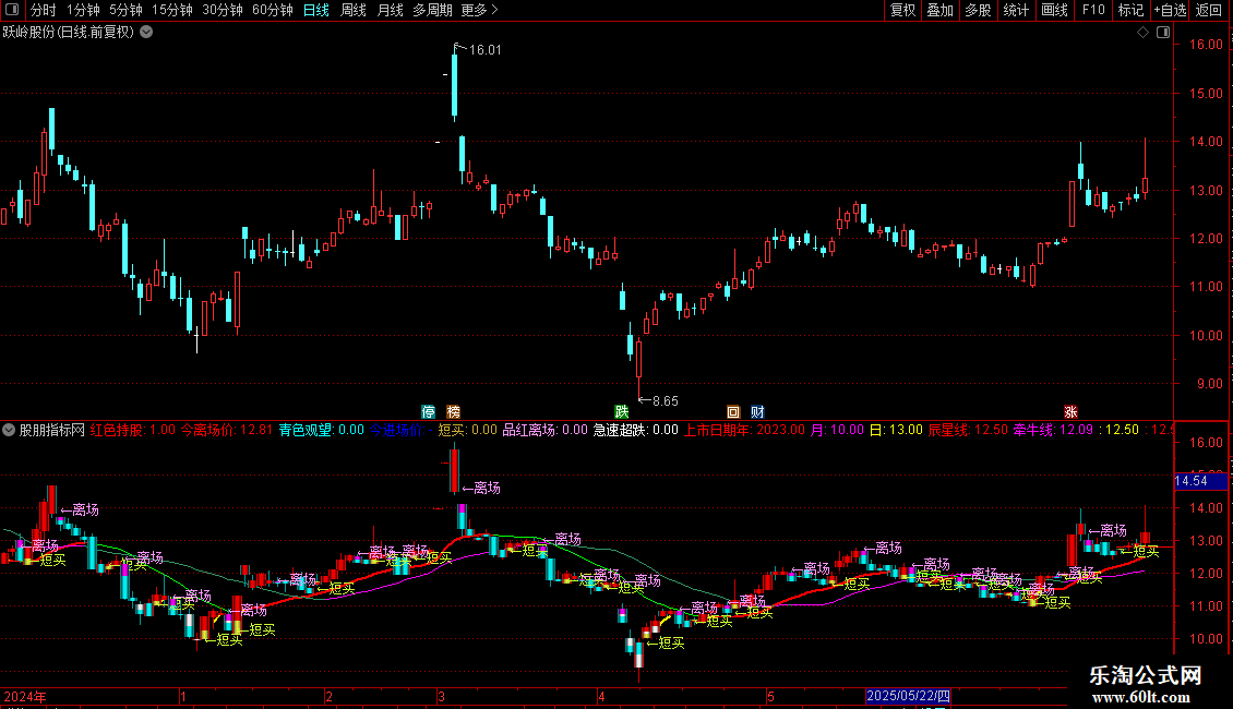 品红离场:在“红色持股”状态结束后,首次出现“青色观望”状态时触发,在K线上方标记“←离场”文字。