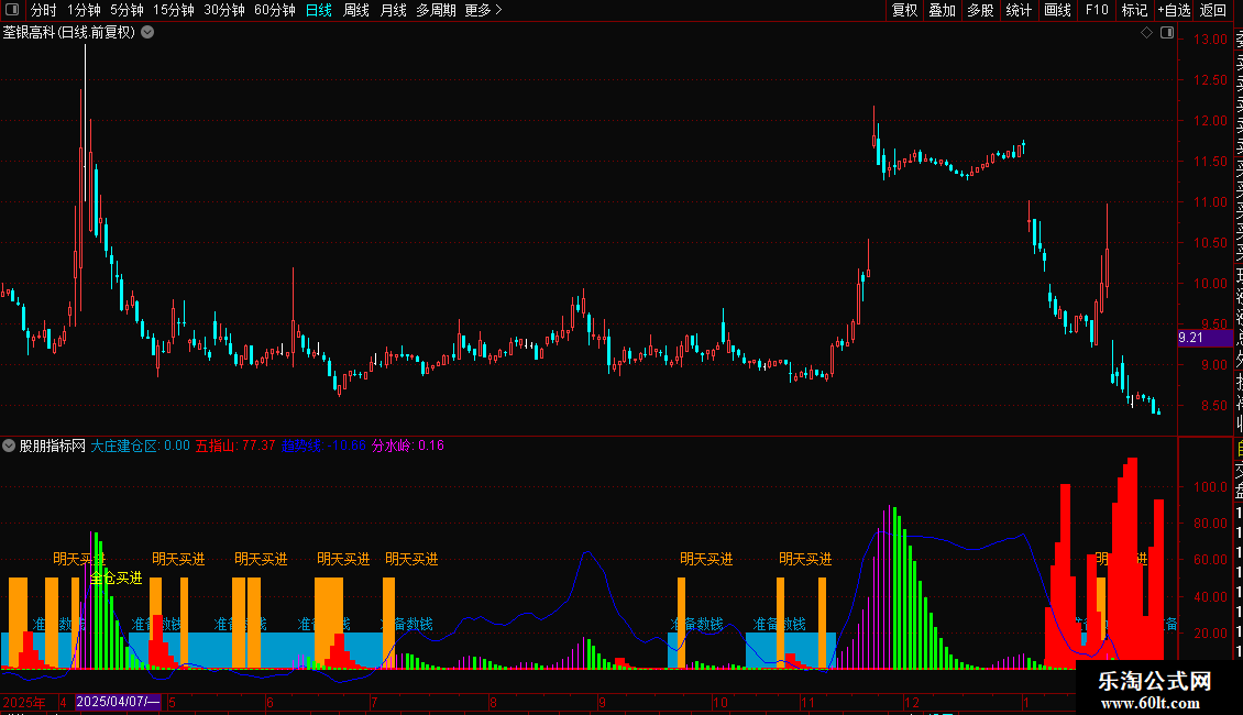 准备/买进信号:当“趋势”线数值小于等于13,并且开始向上拐头(VAR4大于13)时,指标会分别标注“准备数钱”和“明天买进”文字,并显示蓝色柱状。