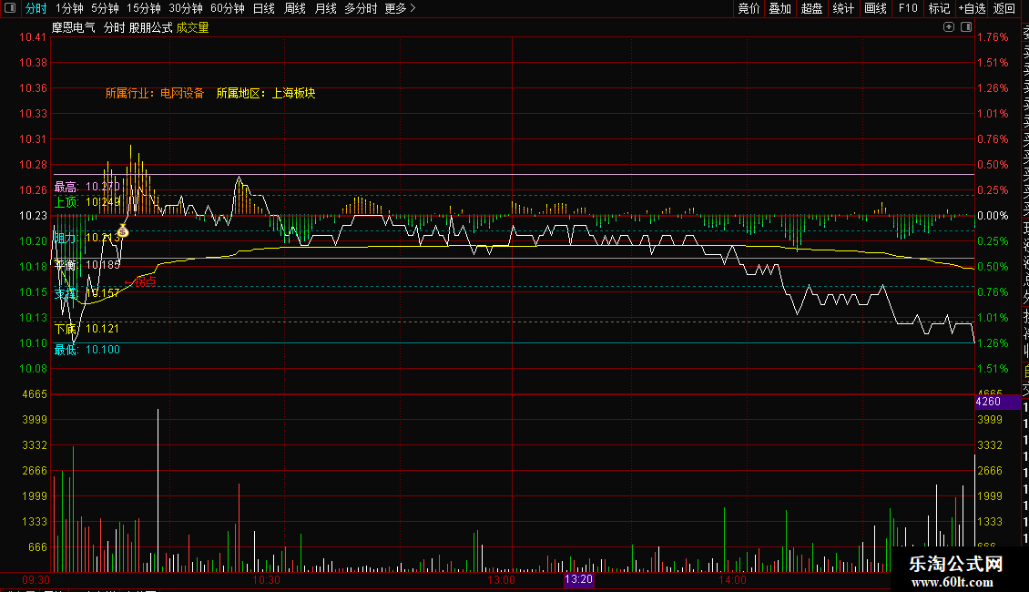 本指标是一款功能强大的通达信分时主图指标,专为捕捉日内关键转折与启动信号而设计。其核心通过短期(2周期)与中期(6周期)价格均线差值构建动能柱(ZBGS2),并以多色阶梯式渲染——上涨时由深蓝渐变为亮青,下跌时由墨绿过渡至鲜绿,直观反映多空力量强弱变化。同时,指标自动绘制当日最高、最低、中轴平衡线及黄金分割位(上顶、阻力、支撑、下底),辅助判断关键压力与支撑区域。更引入两大实战信号:一是“日内起爆”——当价格站上均价、量价同步创新高且涨幅温和(≤2.5%)时触发;二是“拐点”信号——基于60周期高低点时序关系,识别趋势反转节点。此外,还显示所属行业与地区信息,提升盘面分析维度。