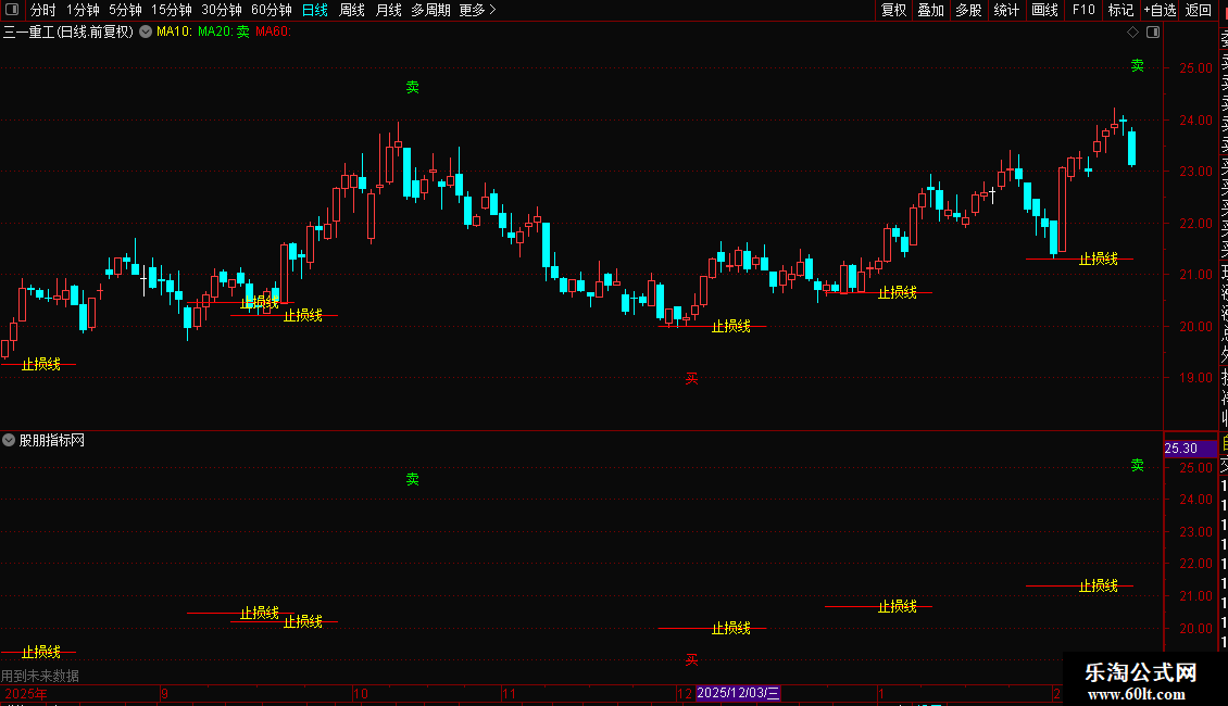- 当AF成立时,在最近4日最低价位置绘制红色柱状线(高度50,线宽3倍),并标记黄色文字“止损线”。