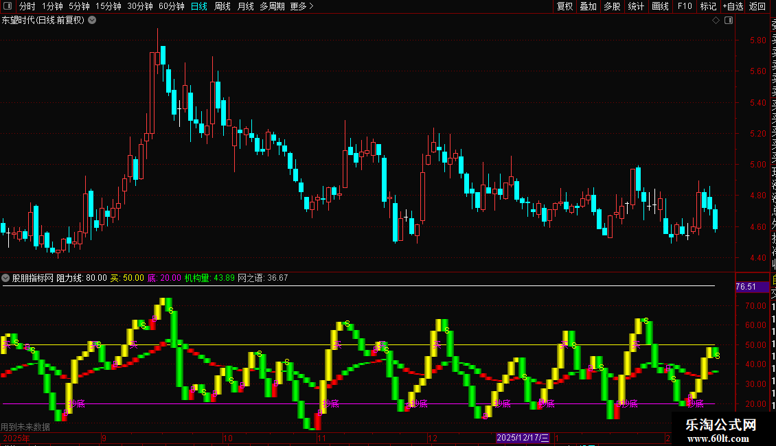 2. 参考线:提供阻力位(80)、买入参考位(50)和底部参考位(20)。