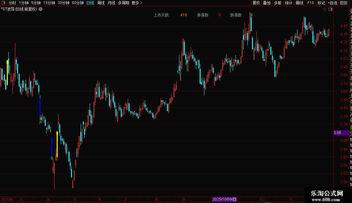 3. 在K线图左上角固定位置显示“上市天数”、“涨停数”和“跌停数”的统计结果。