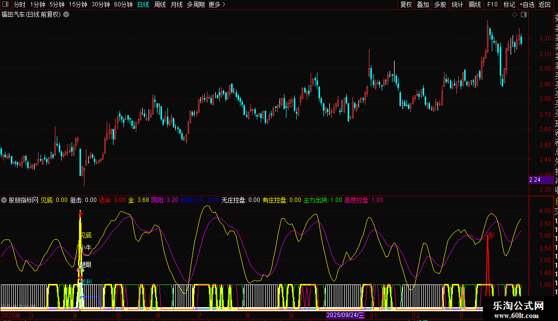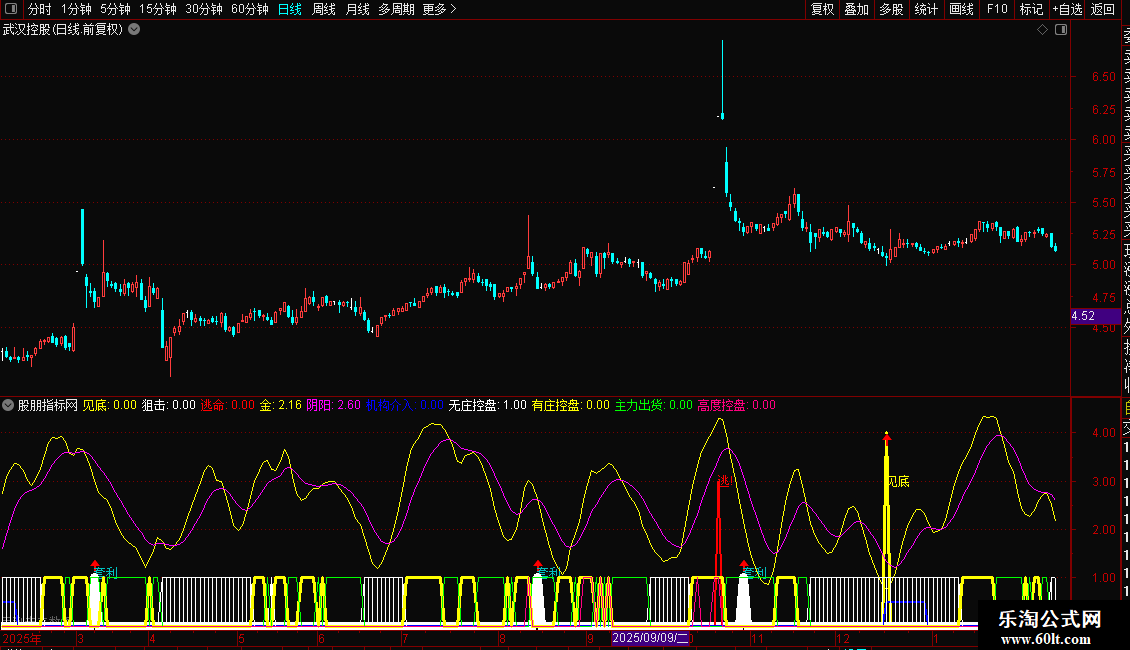 指标将多种信号(如见底、买入、卖出、资金状态)集成在一个副图窗口中显示。