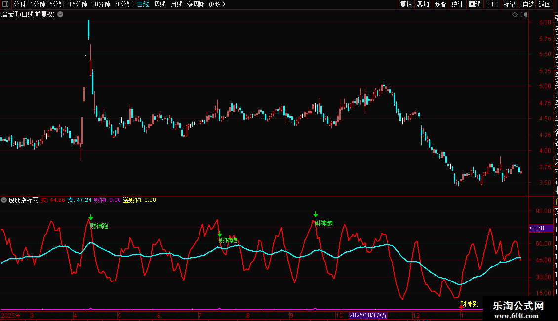 指标基于RSI与KDJ原理构建,包含两条信号线(买、卖)和两个财神信号(财神跑、财神到)。