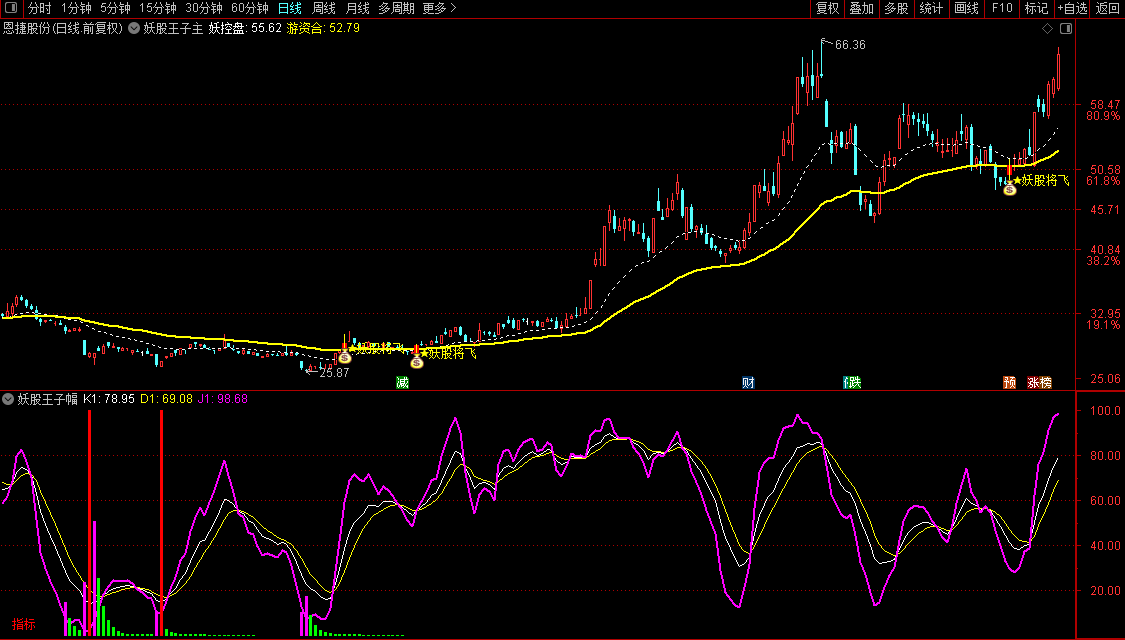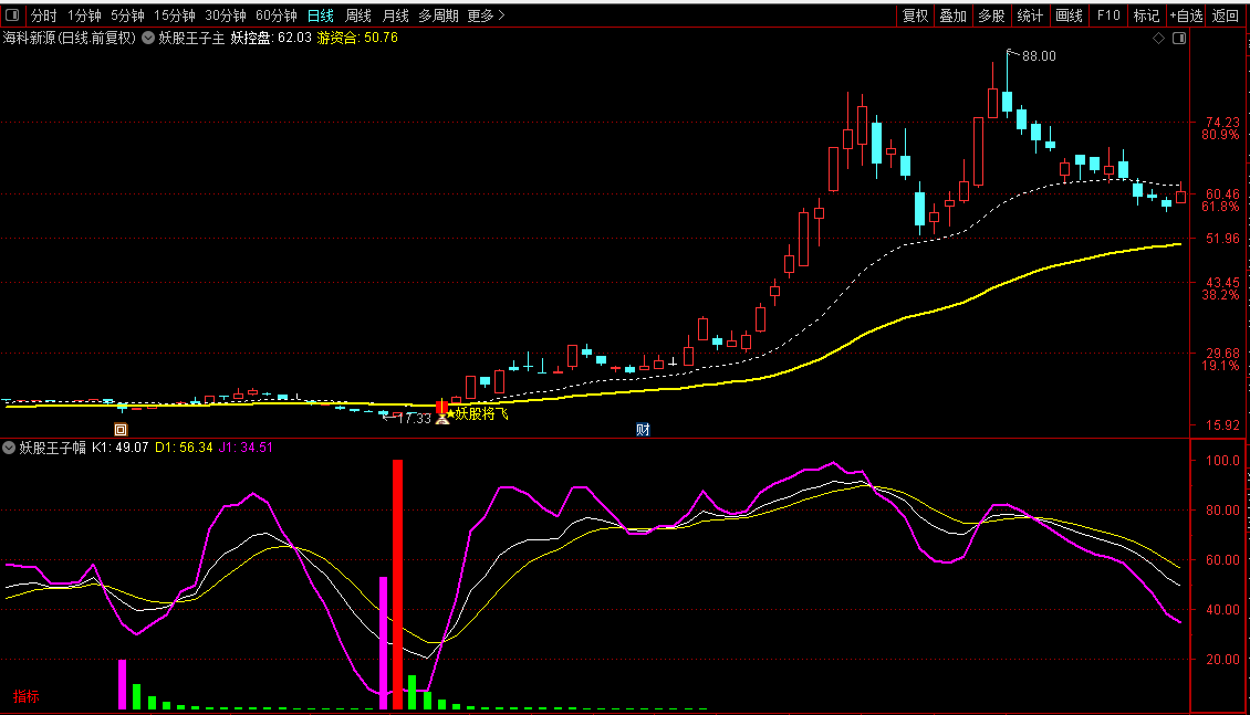 2、行情见底确定之后,主图妖股将飞出现代表即将大幅上涨。