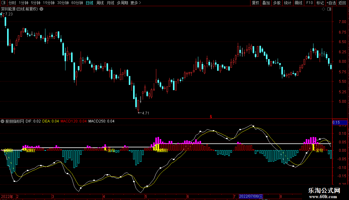 STICKLINE(MACD>=MACD250,MACD250,MACD,2,0),COLORMAGENTA;