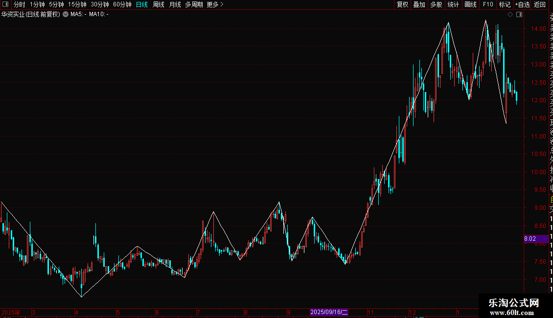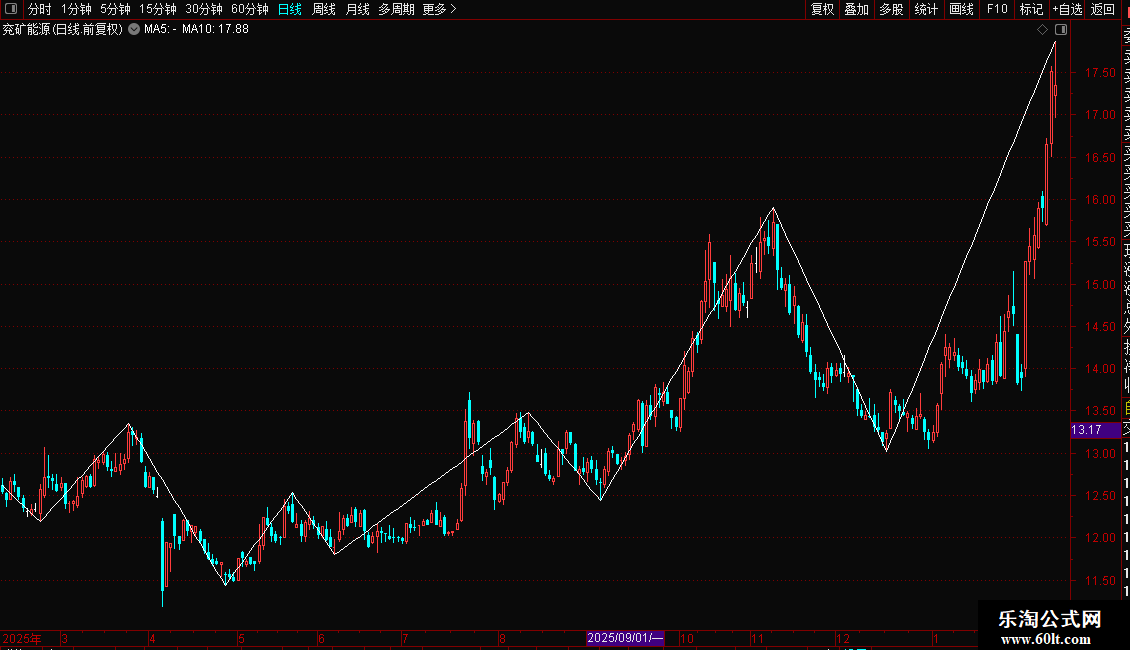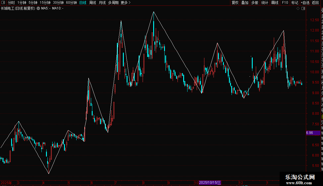 - 自动连接近期高点和低点,形成两条交叉的白色线段。