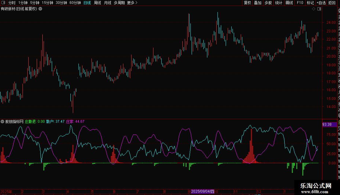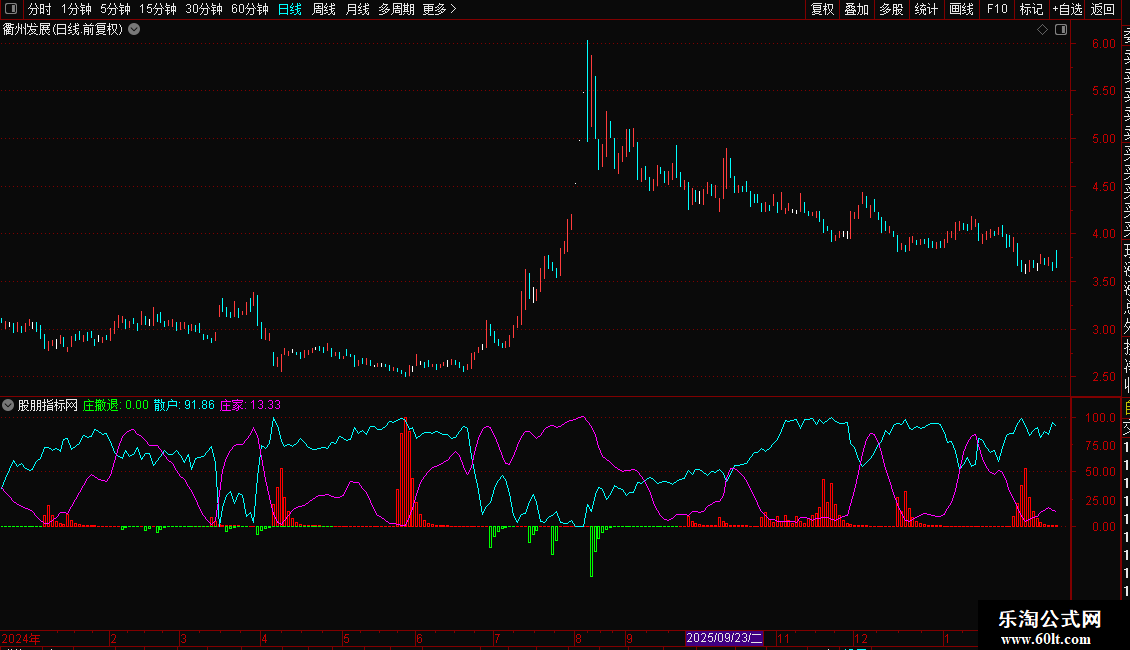 4. 庄家:紫线,代表主力资金动向,与散户线形成对比。