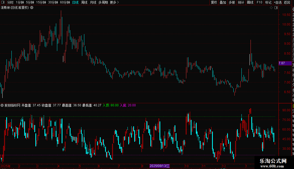 此外,指标包含一个综合信号(VAR13),该信号在满足特定条件时(如价格与成交量关系、短期相对位置超跌及价格动量极度疲软)会输出数值30。图表中还设置了80和20两条水平参考线,用于标识数值的潜在超买和超卖区域。