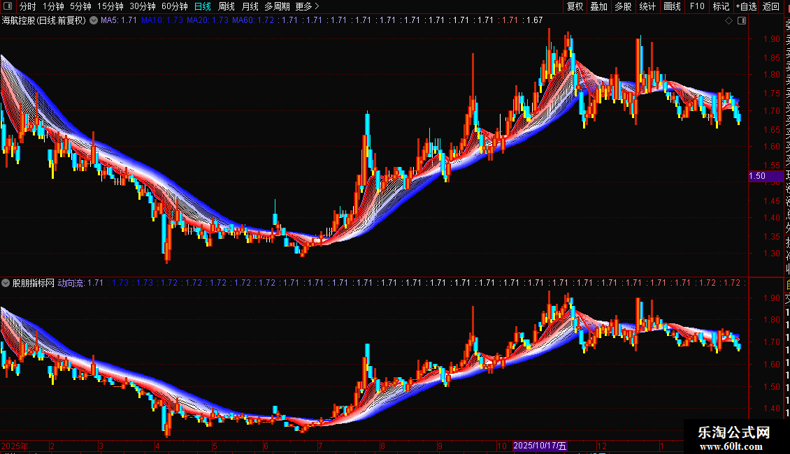 2. 绘制多层均线带:以“动向流”为基础,计算并绘制从2日到30日共29条移动平均线,形成一条由密到疏、颜色渐变的均线带,用于直观展示短期到中期的价格支撑与压力层次。