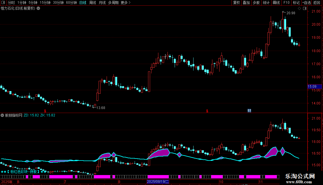 - 当价格在通道上轨(ZD)附近运行且下方出现粉红色彩块时,视为持股或看多信号。