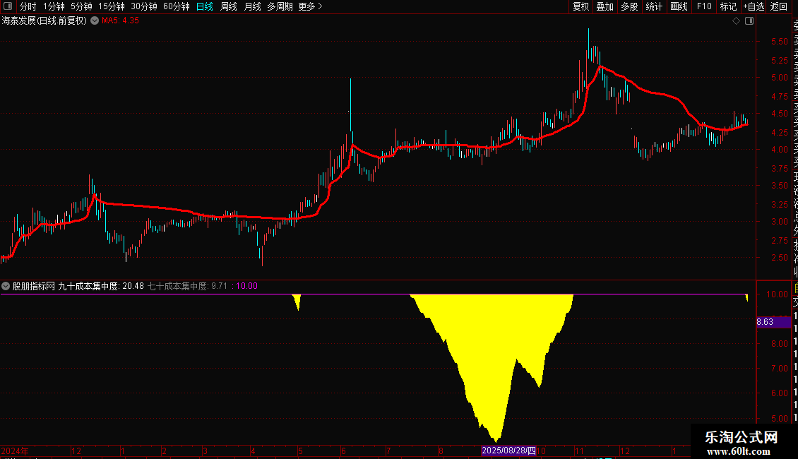 - 通过色带直观显示集中度是否低于10%(阈值)。低于10%时色带变色,提示筹码高度集中。