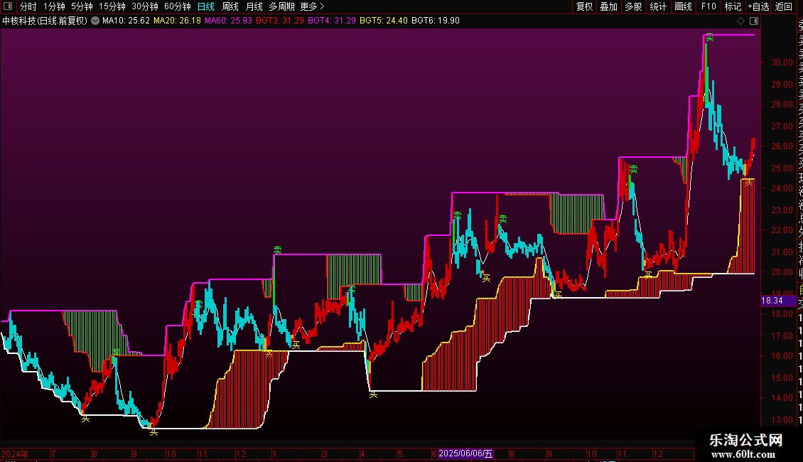 3. 支撑压力:红色BGT3(30日高点)、洋红BGT4(60日高点)为压力位;黄色BGT5(30日低点)、白色BGT6(60日低点)为支撑位,BGT5上穿BGT6时红线加粗,提示支撑走强。