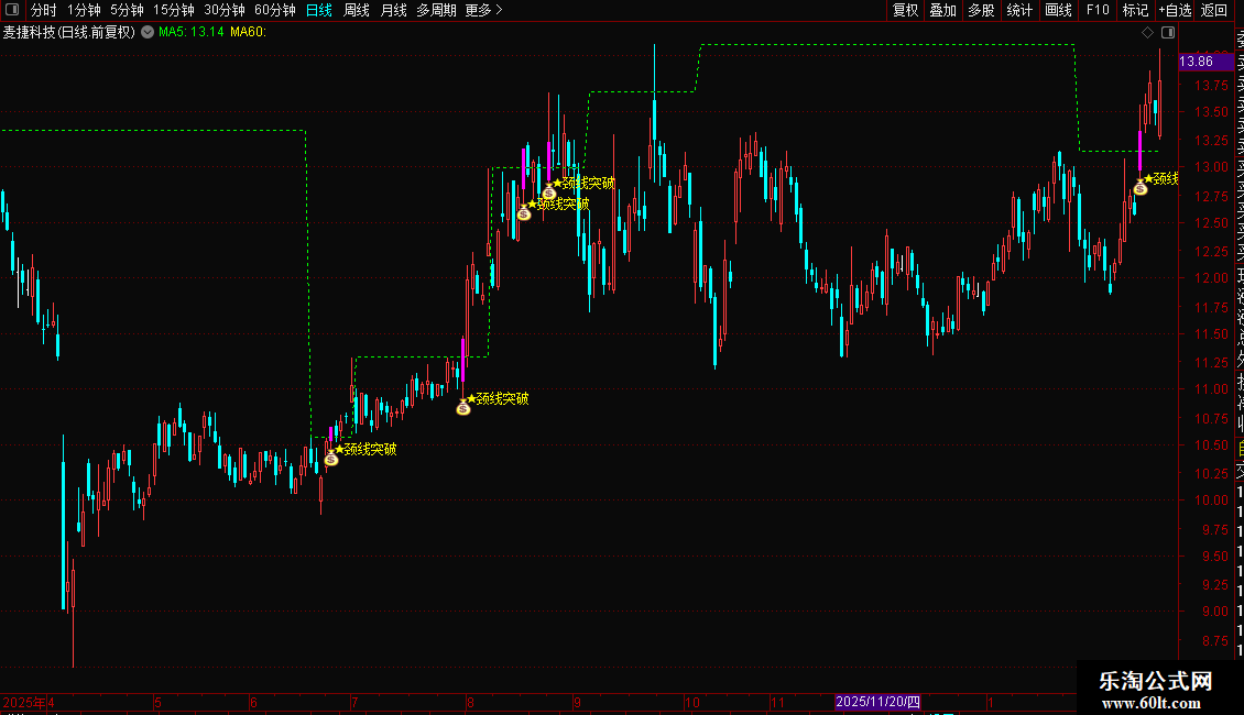 DRAWTEXT(IF(VAR1>VAR14,IF(REF(VAR9< VAR14,1),1,0),0),L,' ★颈线突破'),COLORYELLOW;
