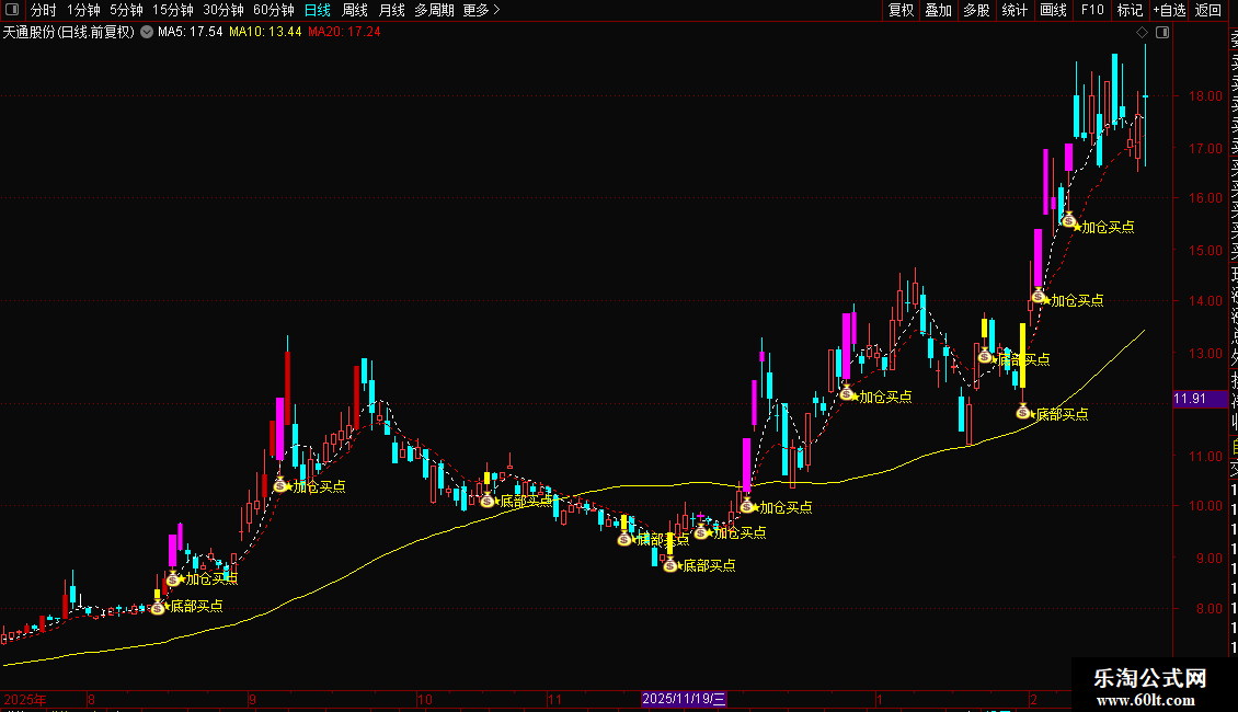 “加仓买点”和特定的彩色K线(如青色)用于在趋势中寻找跟进时机。